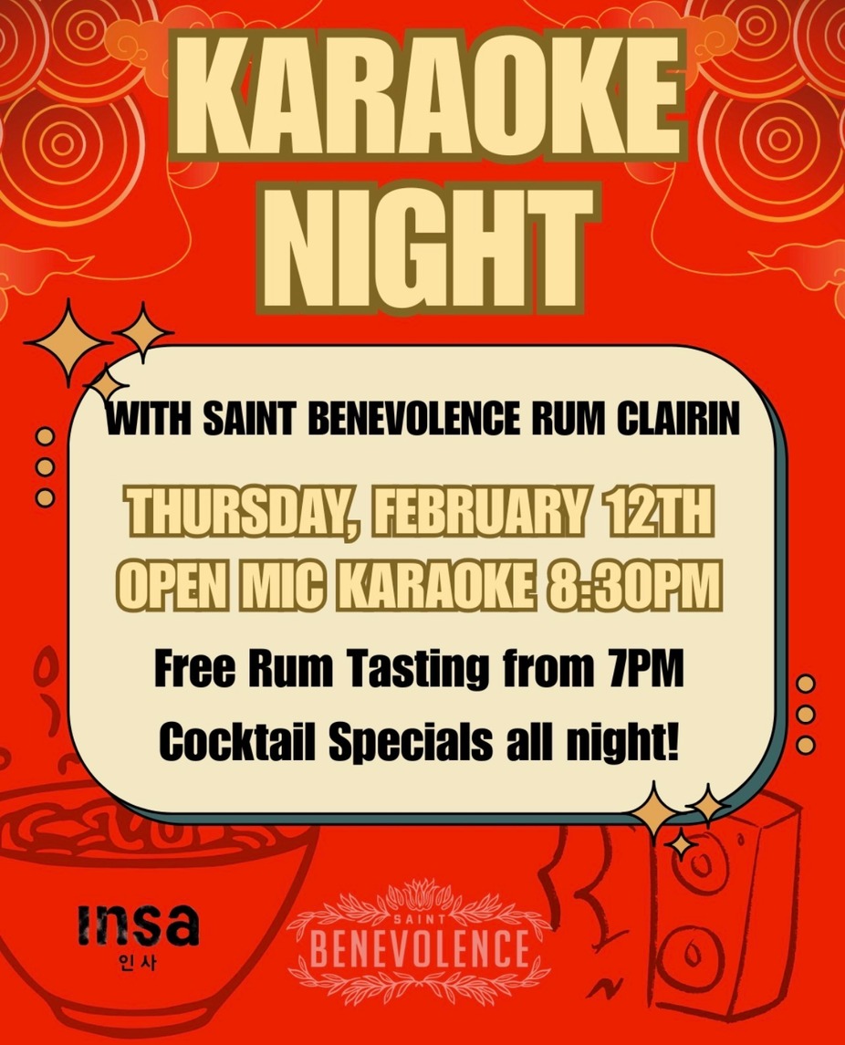 Insa in collaboration with Saint Benevolence Clairin will be hosting a fun tasting before our Open Mic Karaoke night hosted by our one and only Chef Yong!
