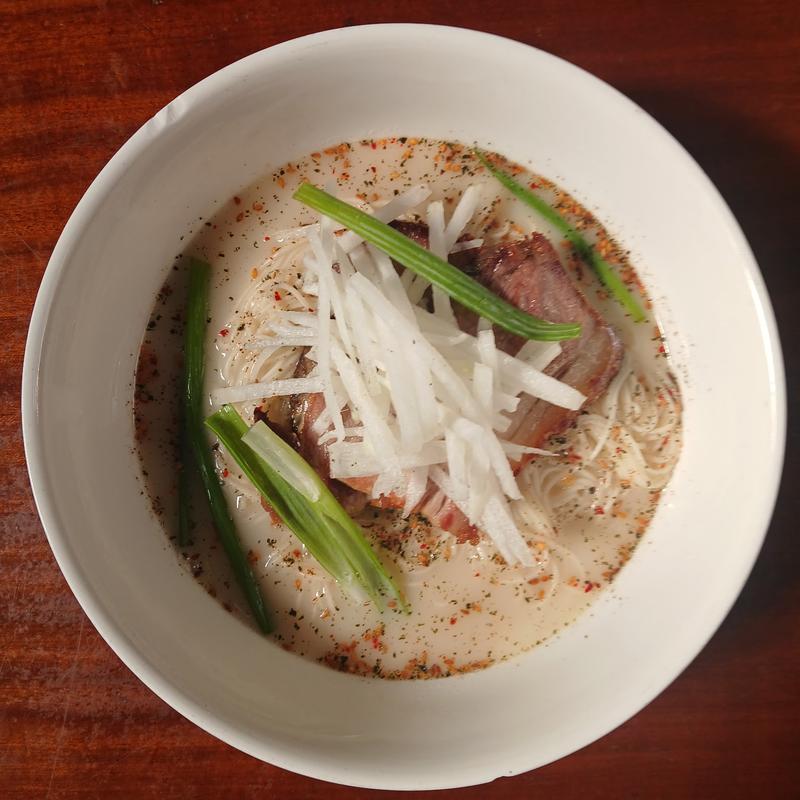 8 Hour Pork Bone Broth with Somen Wheat Noodles, Tender Roast Pork, Woodear Mushroom & Chile Oil