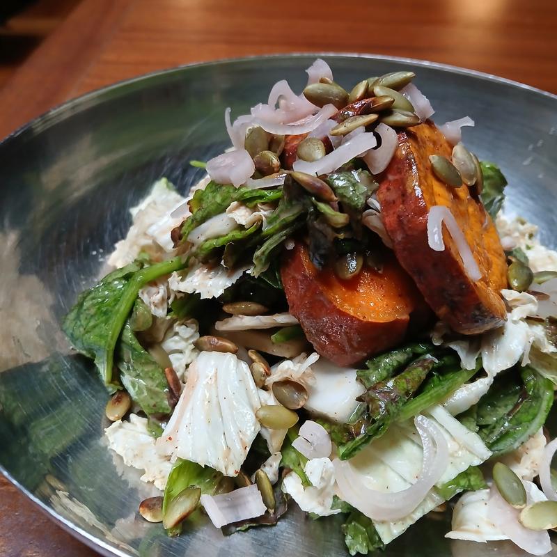 Little Gem & Delicata Squash with Doenjang Honey Vinaigrette, Sweet Potato Chips, & Pickled Goji Berries